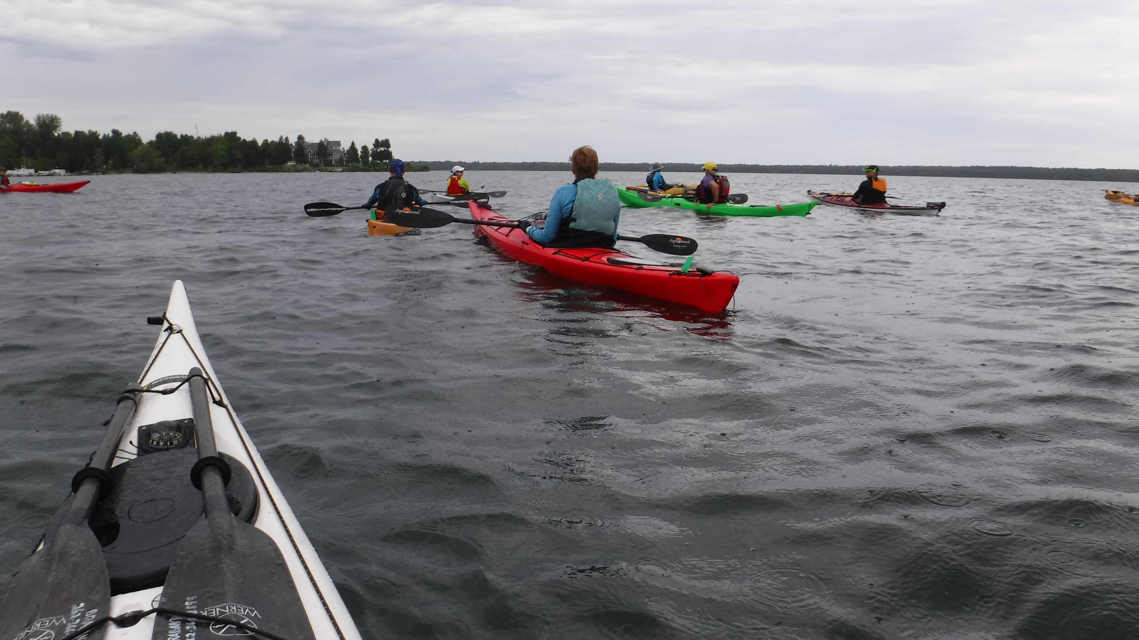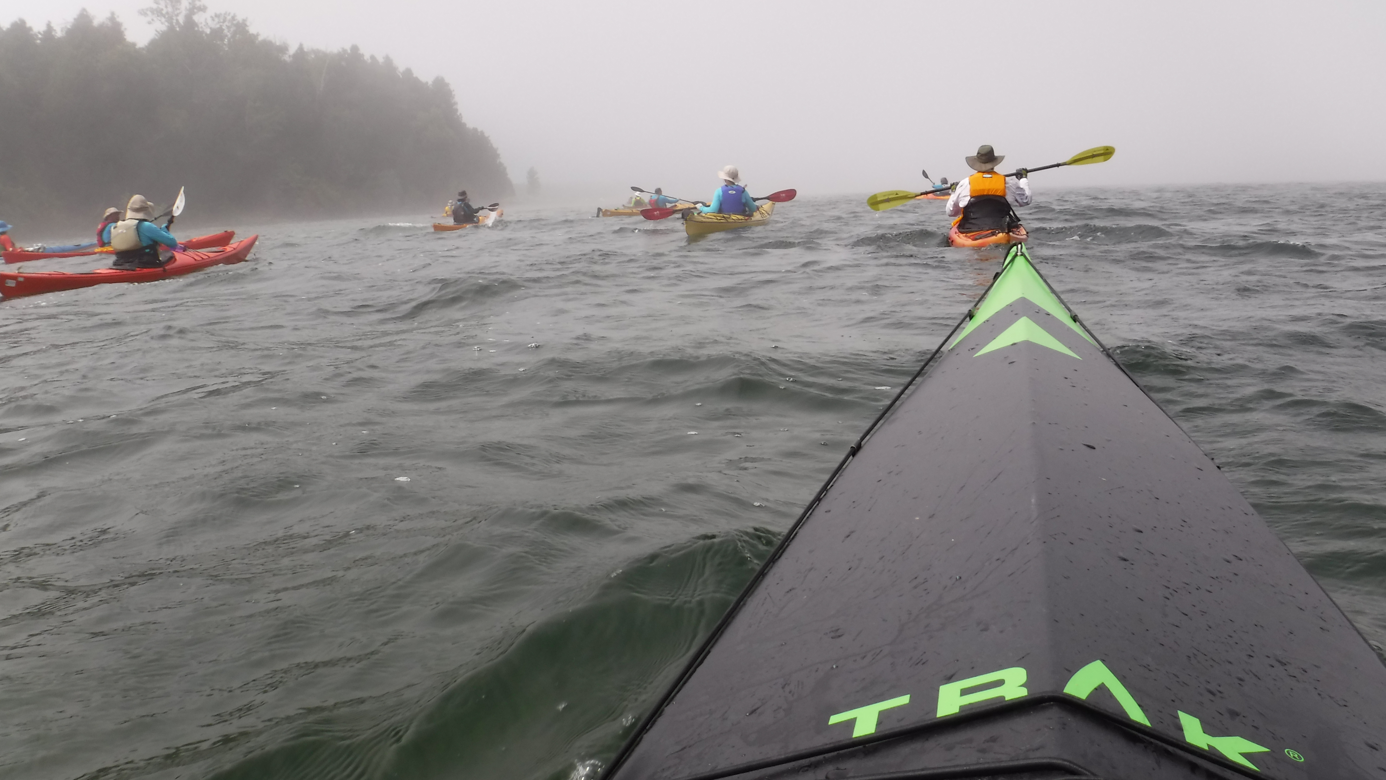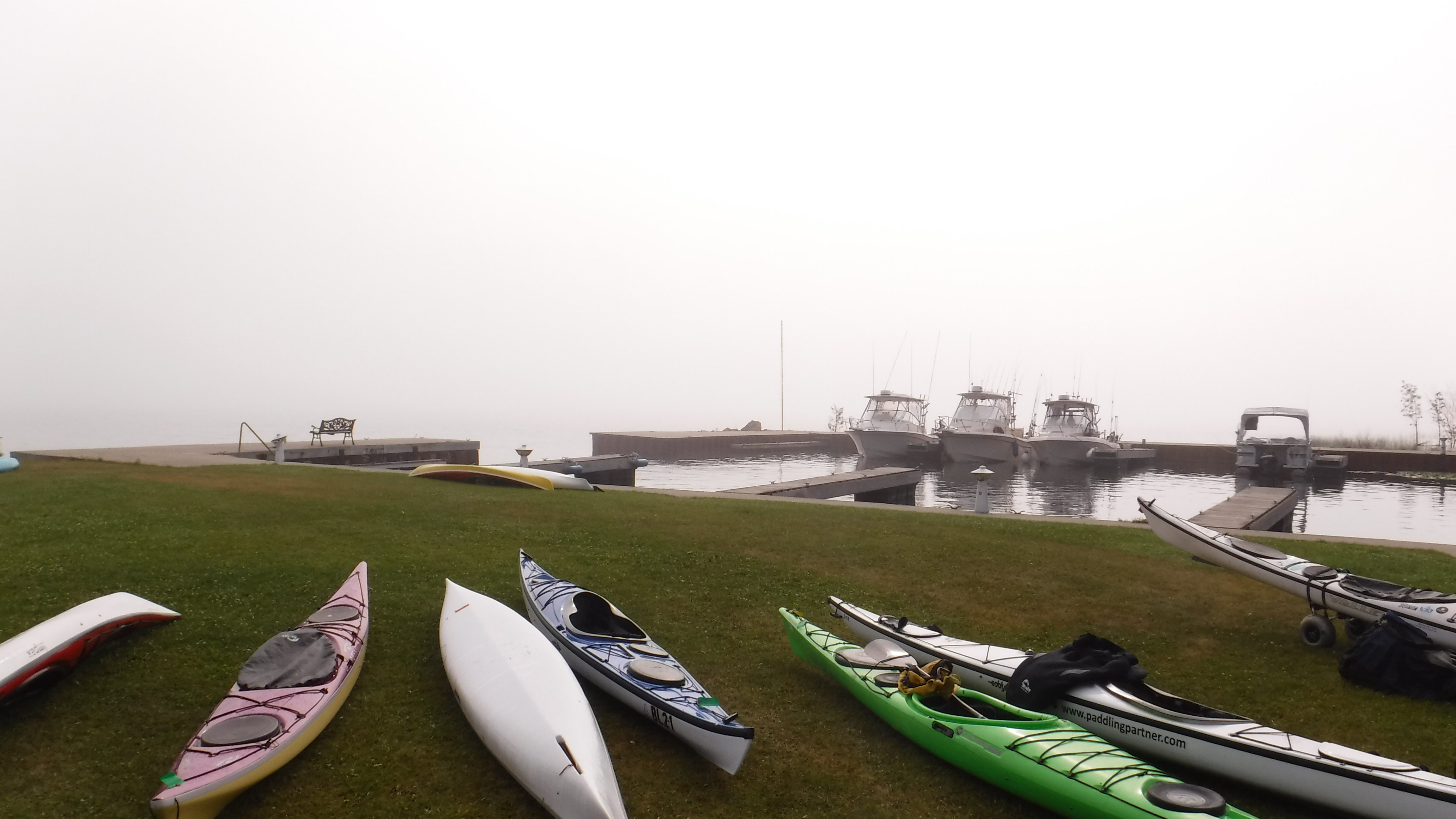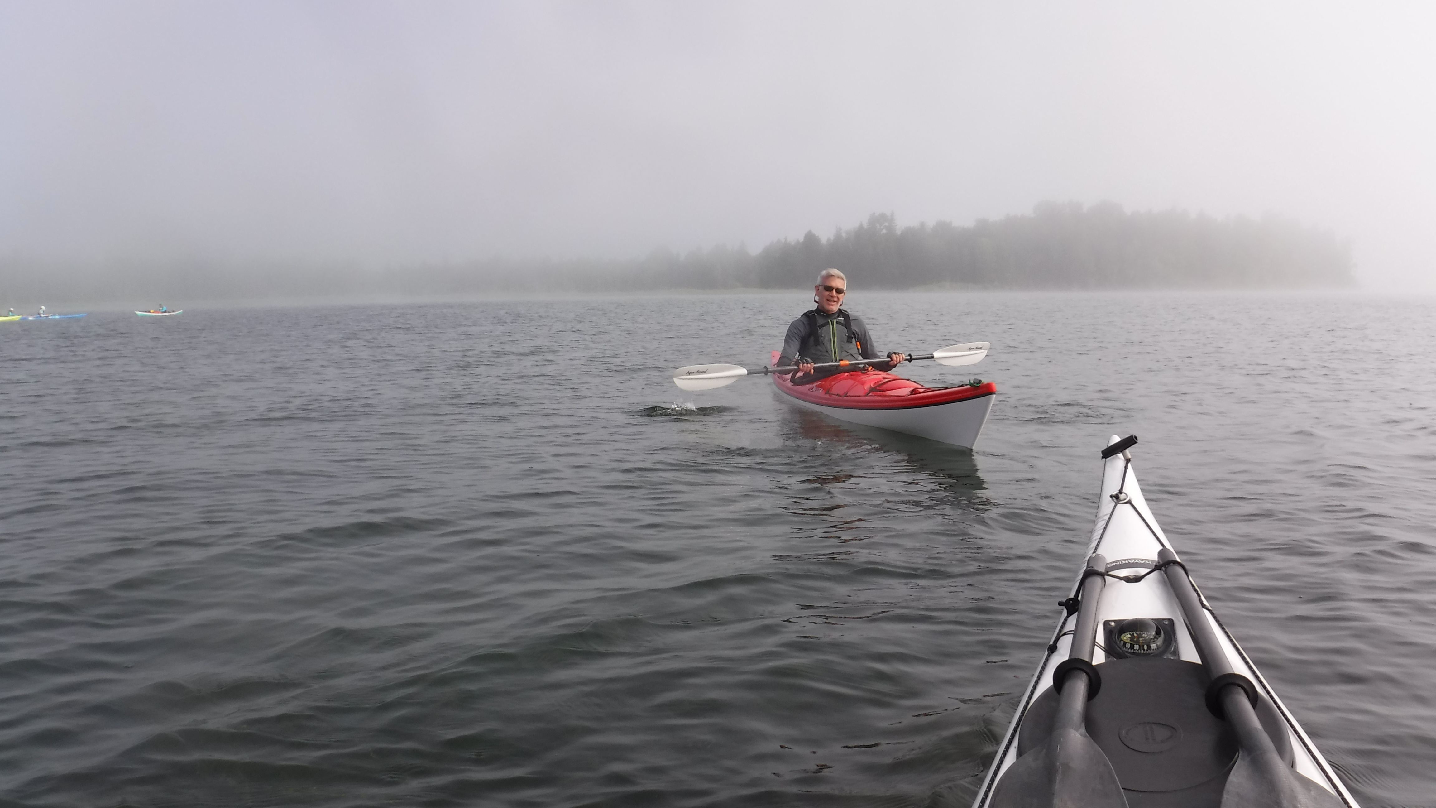 The weather was great all weekend, with only a light rain shower Friday afternoon. In fact we would have preferred to have stronger wind and bigger waves at times for practicing advanced “big water” skills. But, we made do. Sunday’s fog stuck around all day, which provided opportunities to practice compass navigation. Water temperature hovered around 71F on the lake and 80F on the Mink River!