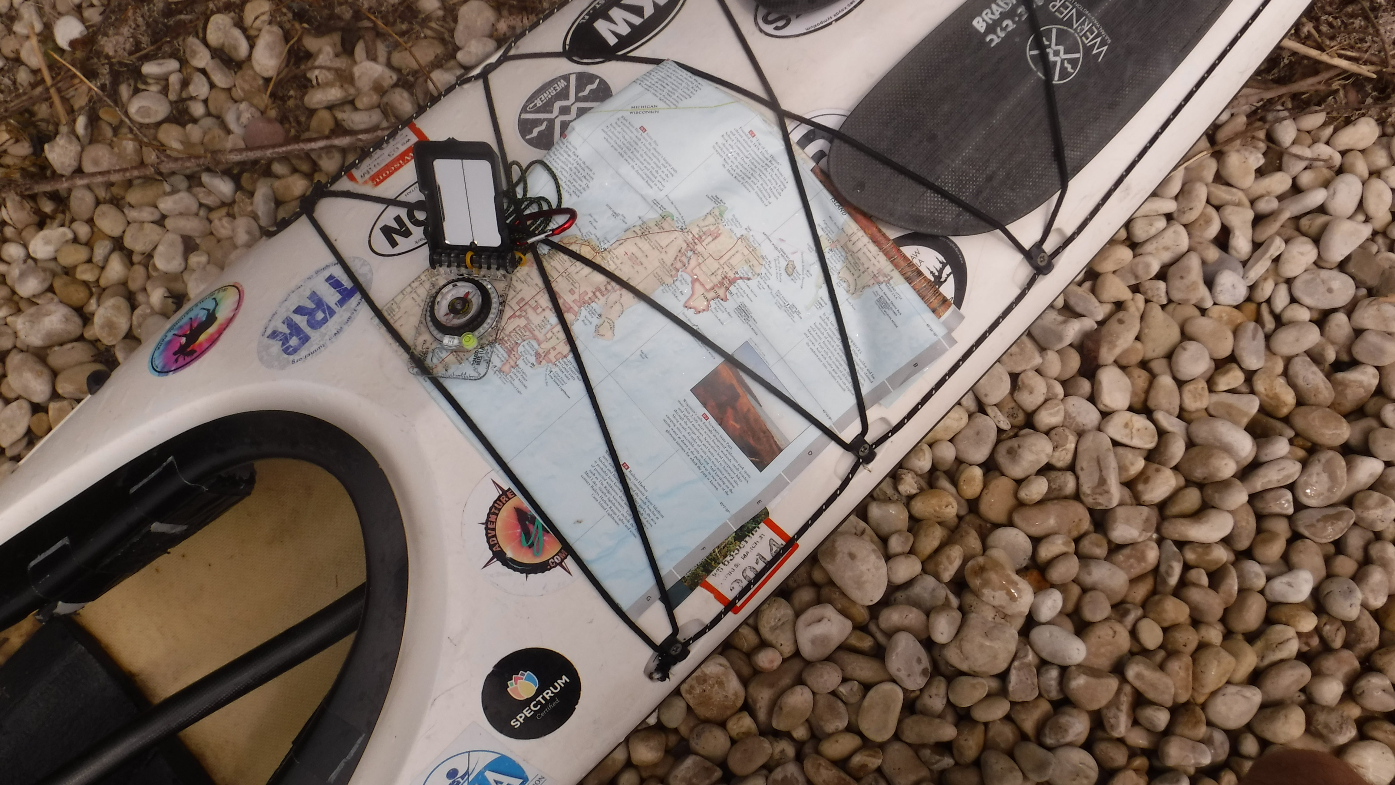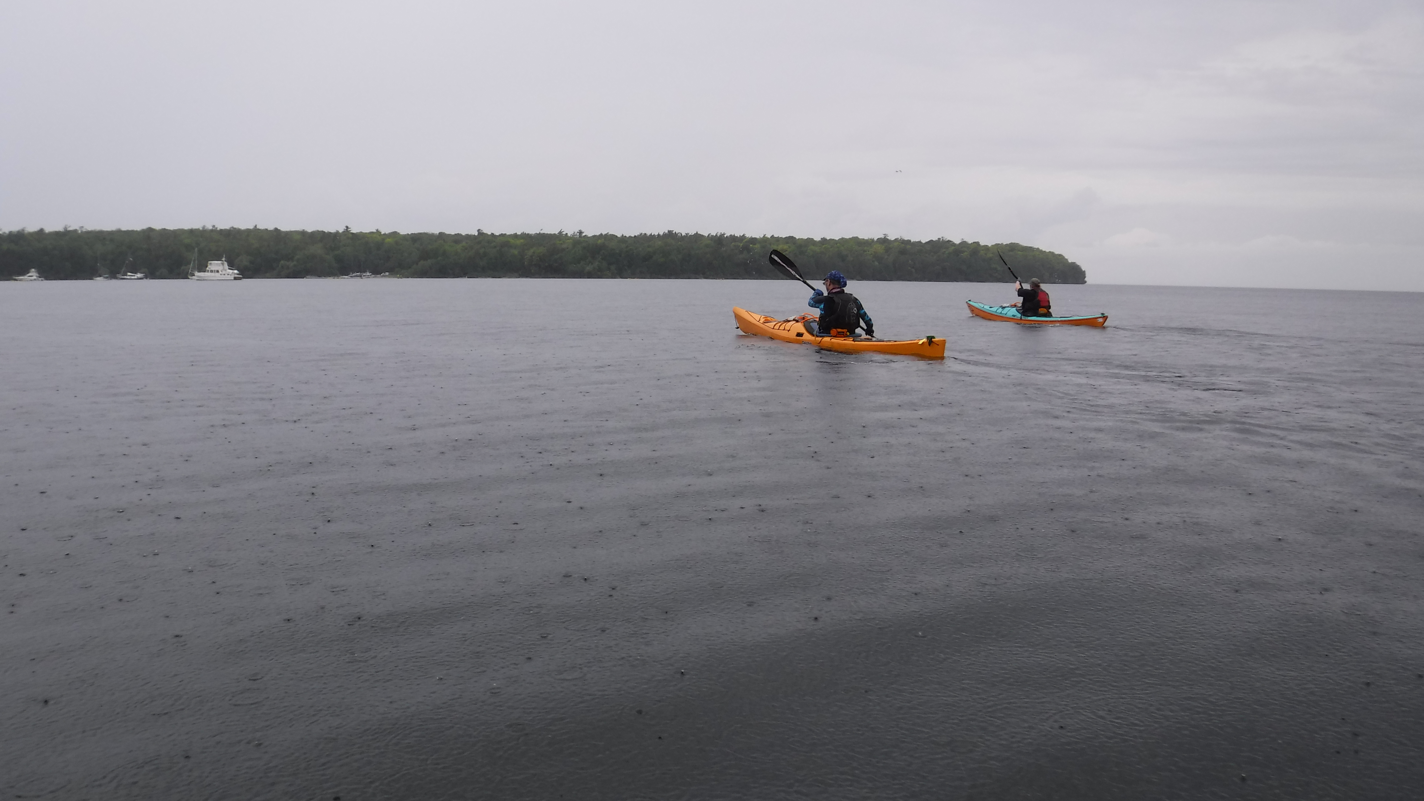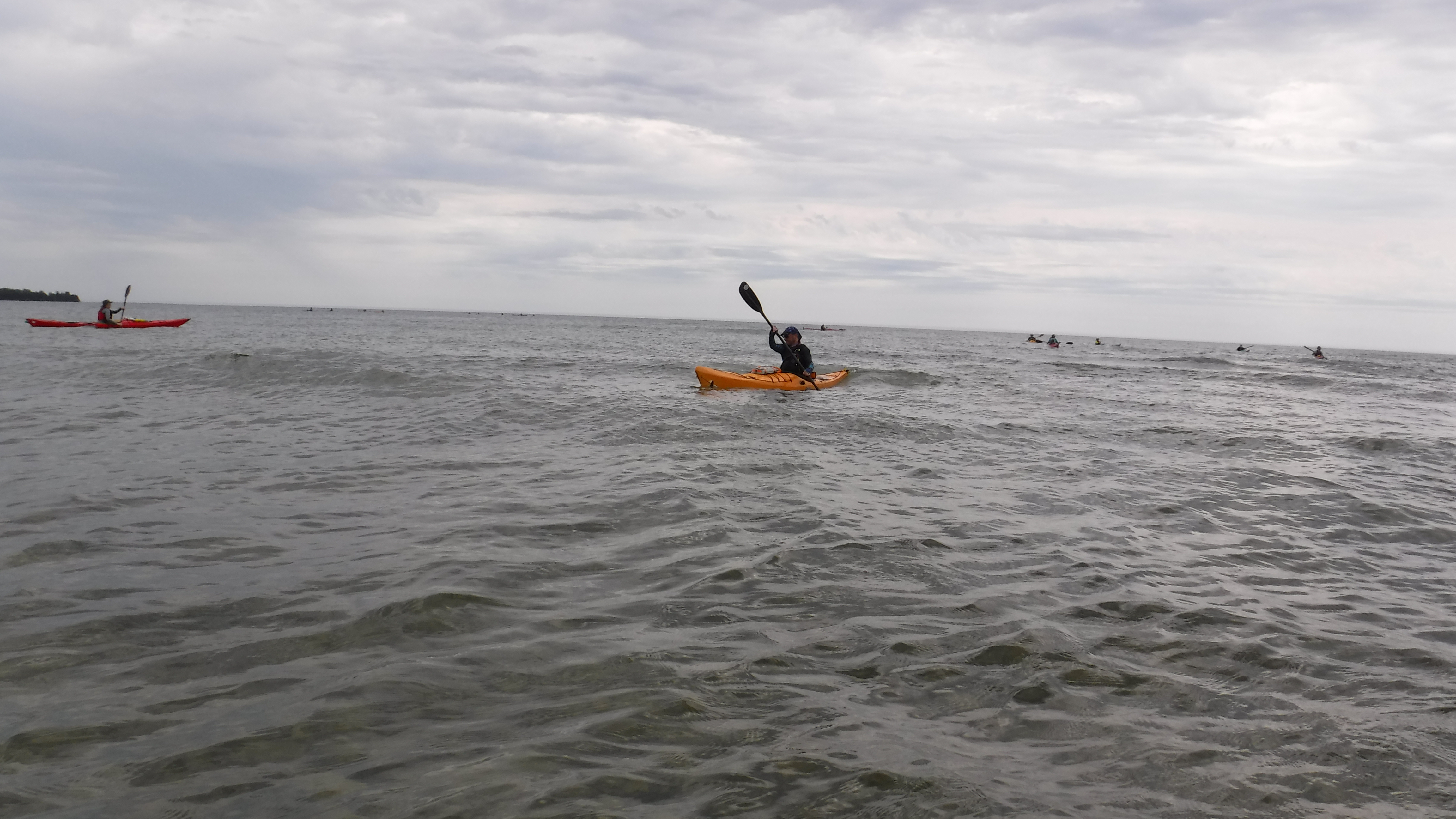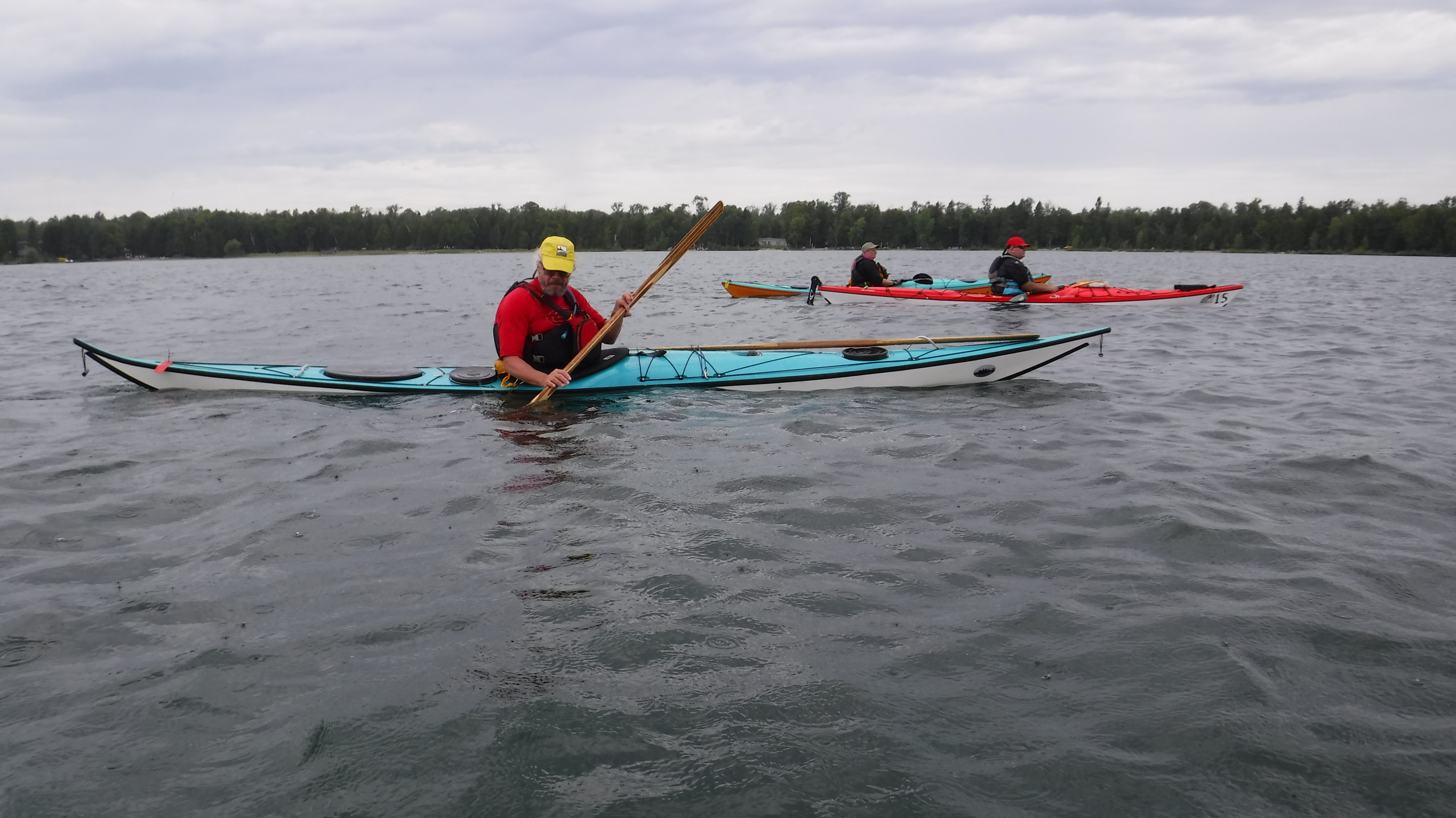 The weather was great all weekend, with only a light rain shower Friday afternoon. In fact we would have preferred to have stronger wind and bigger waves at times for practicing advanced “big water” skills. But, we made do. Sunday’s fog stuck around all day, which provided opportunities to practice compass navigation. Water temperature hovered around 71F on the lake and 80F on the Mink River!