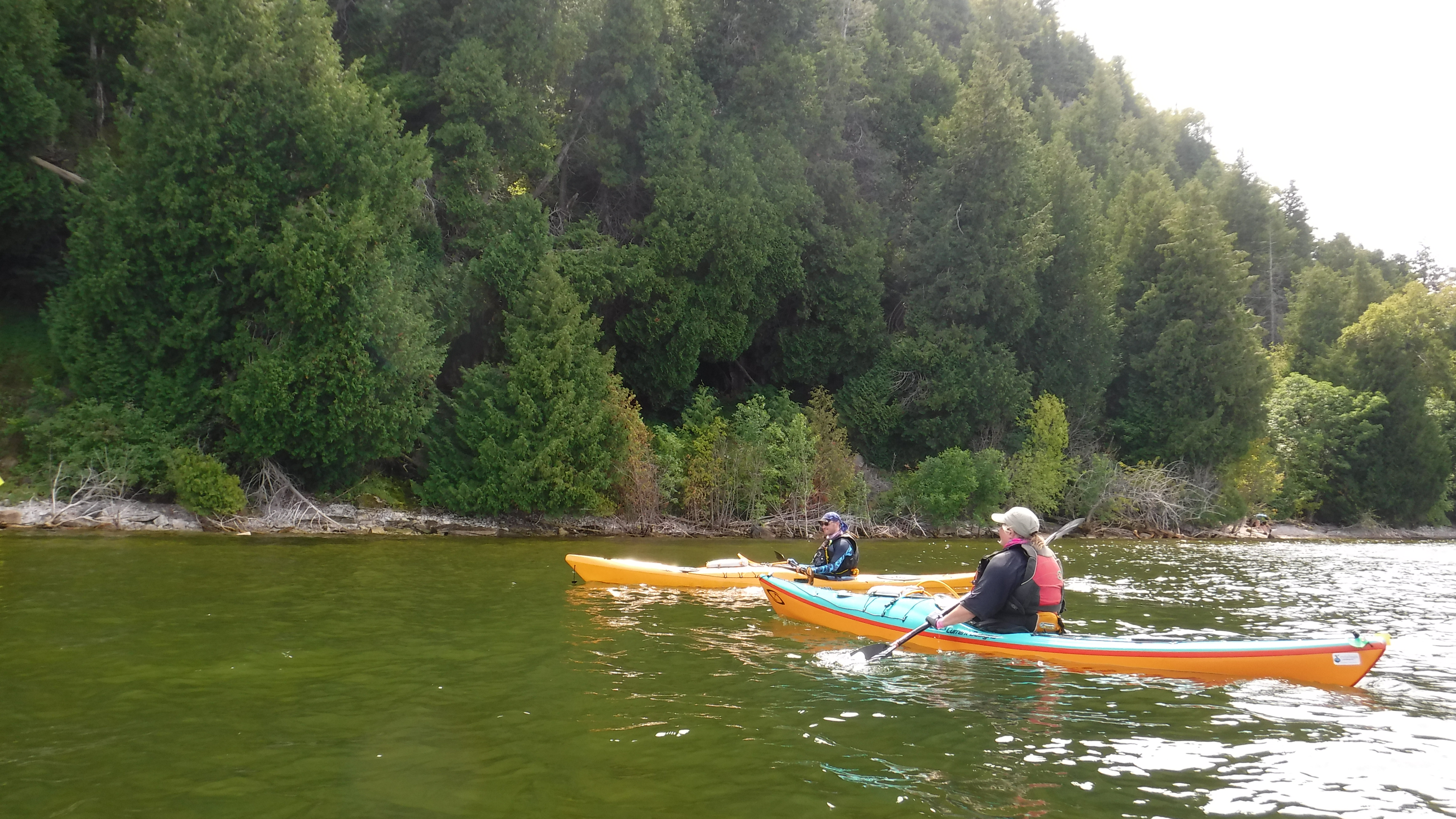 Sara and Dan pass by the cliffs of Peninsula State Park on our way from Horseshoe Island to Ephraim.