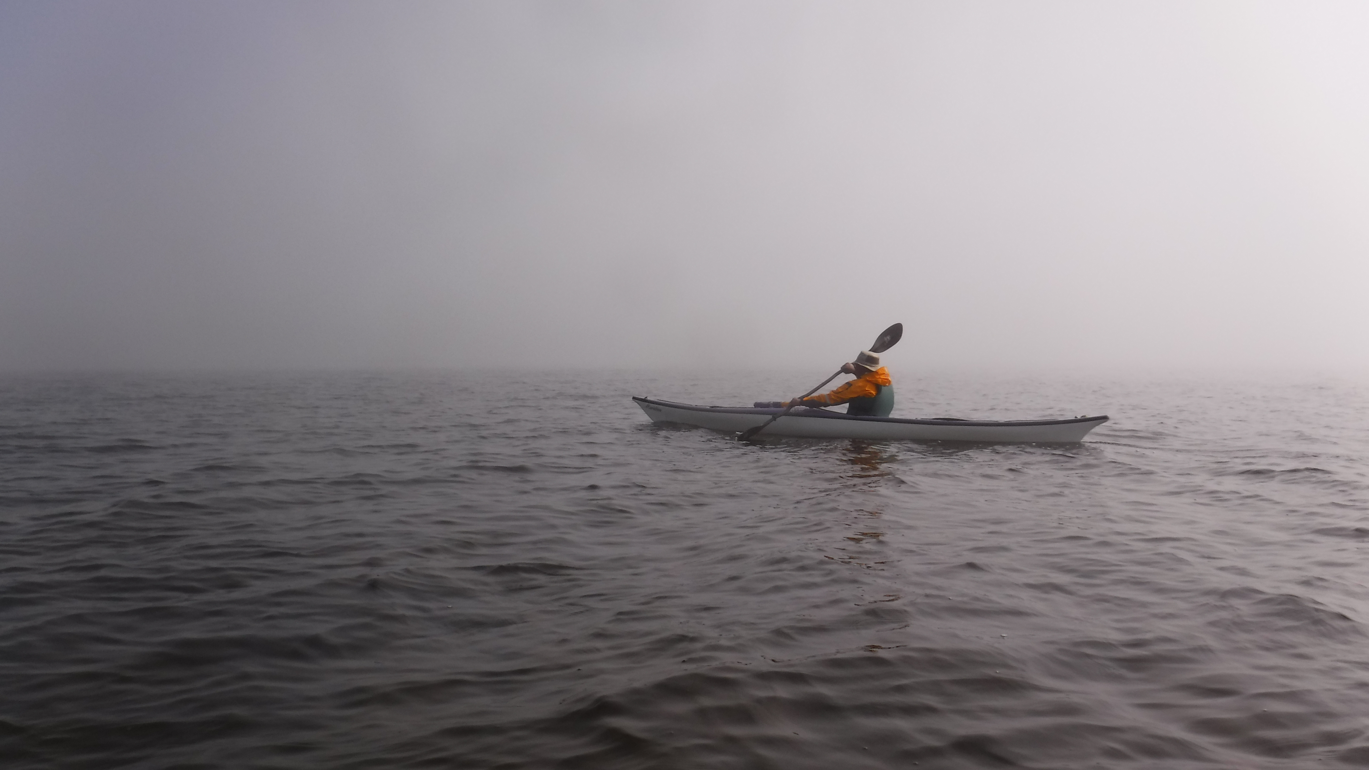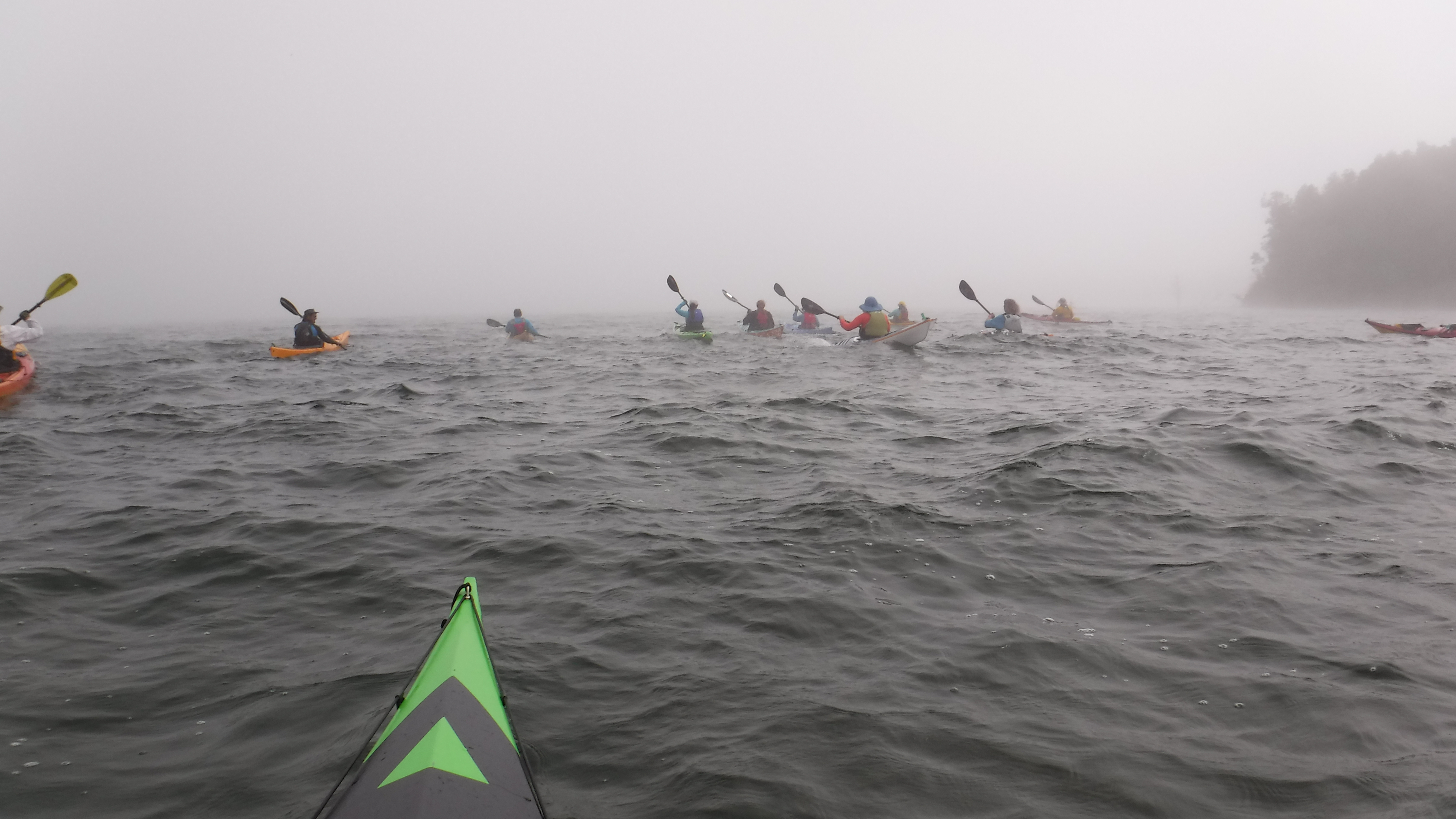 Paddling through the fog toward the mouth of the Mink River