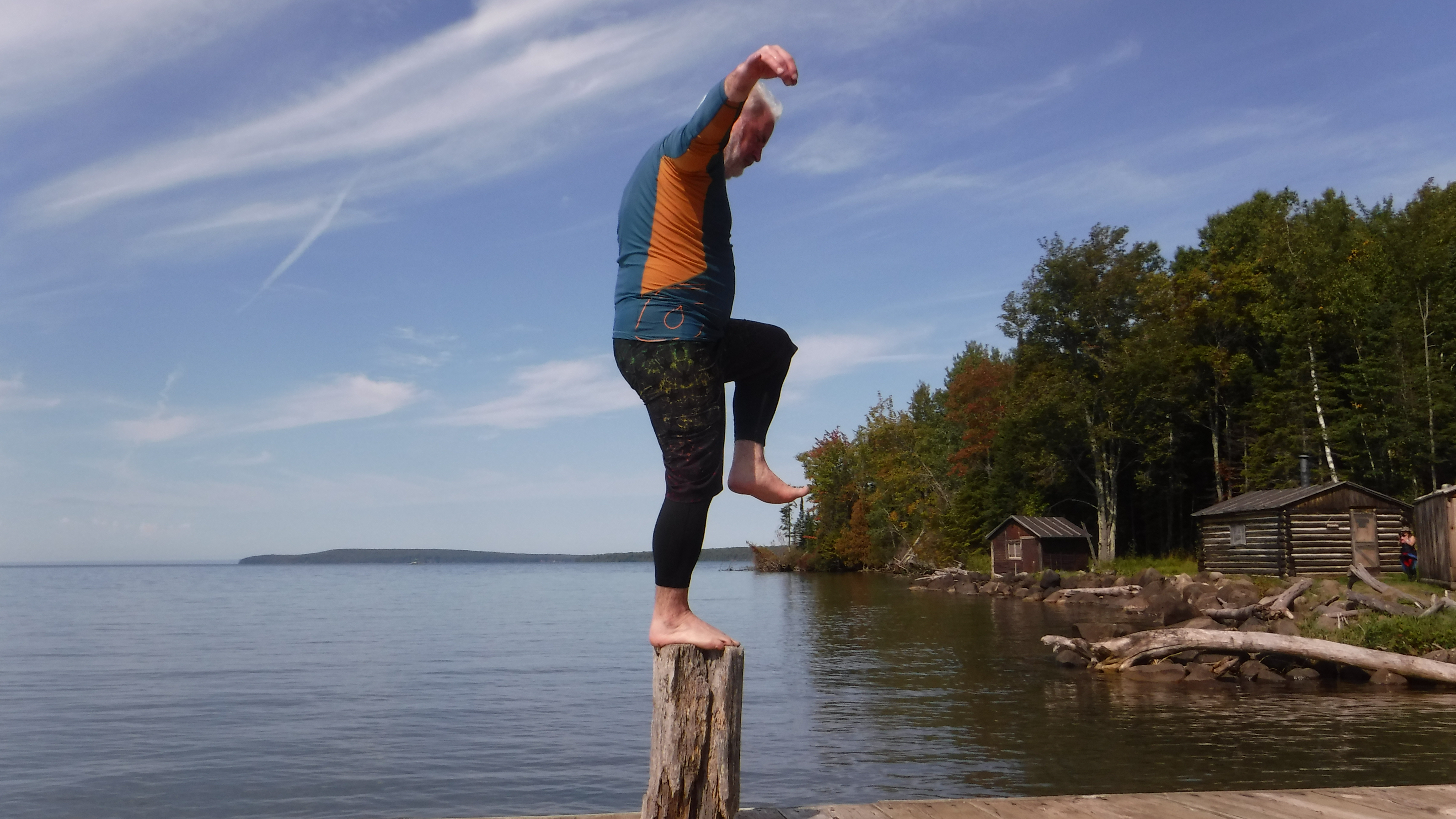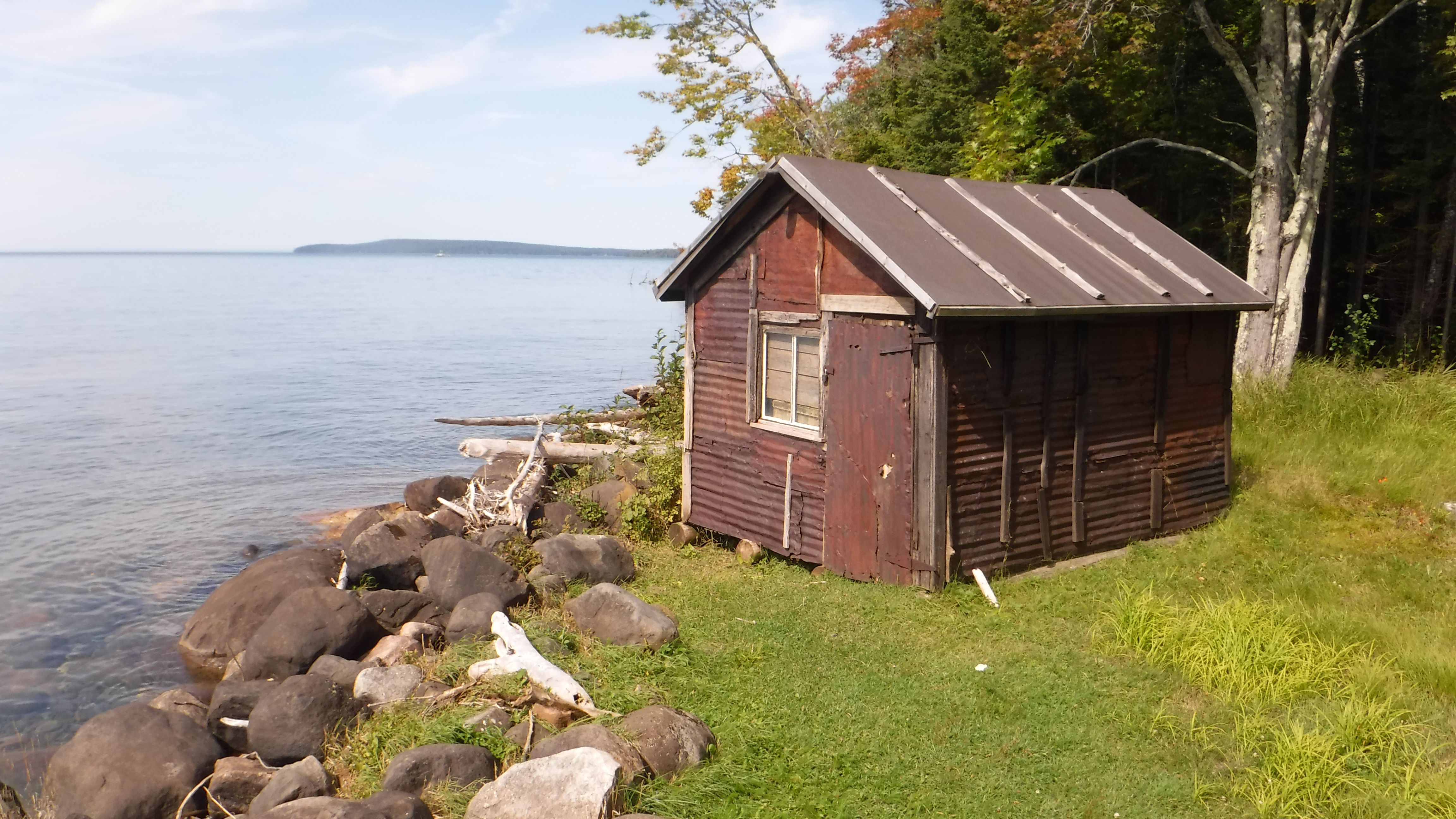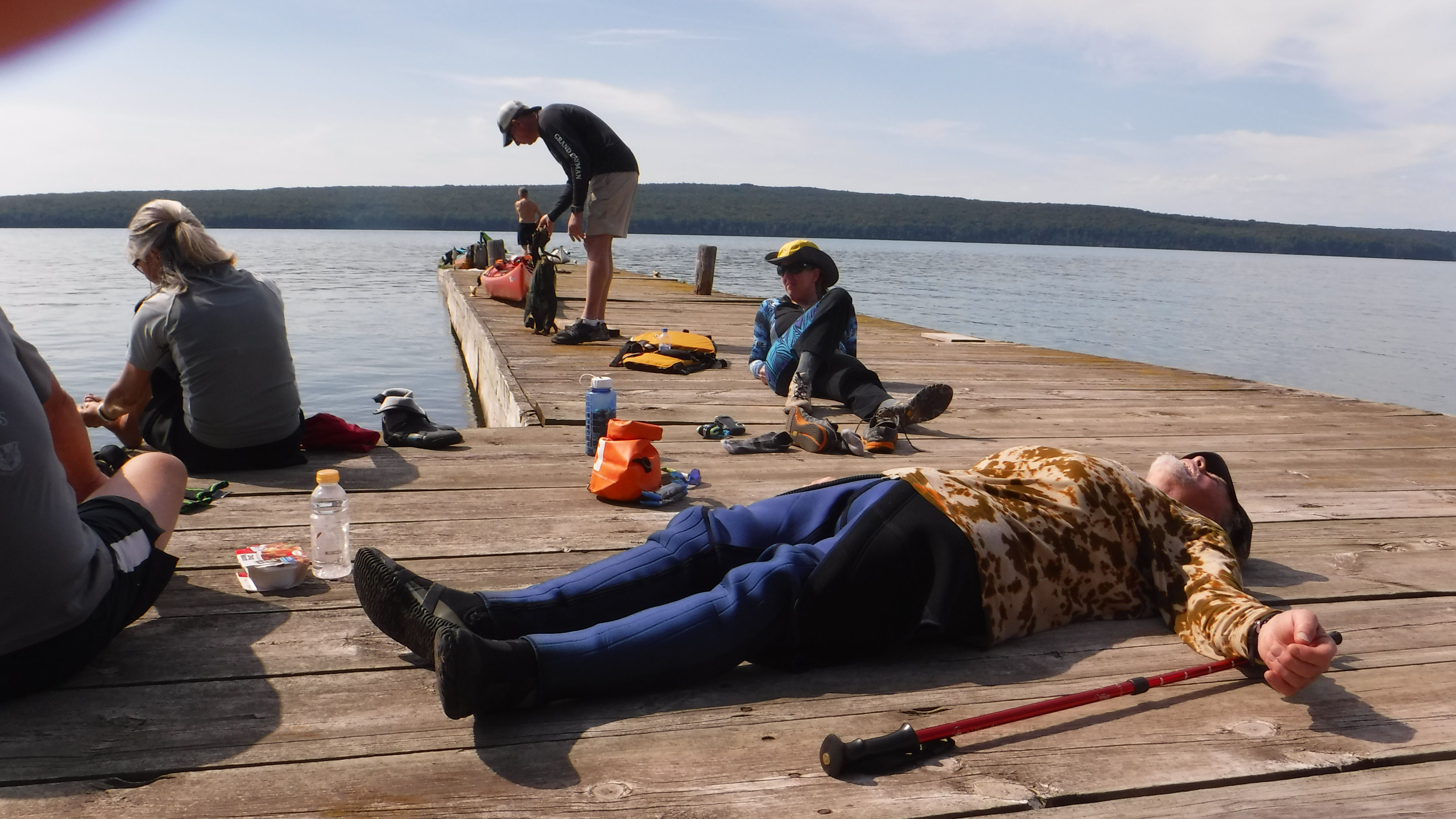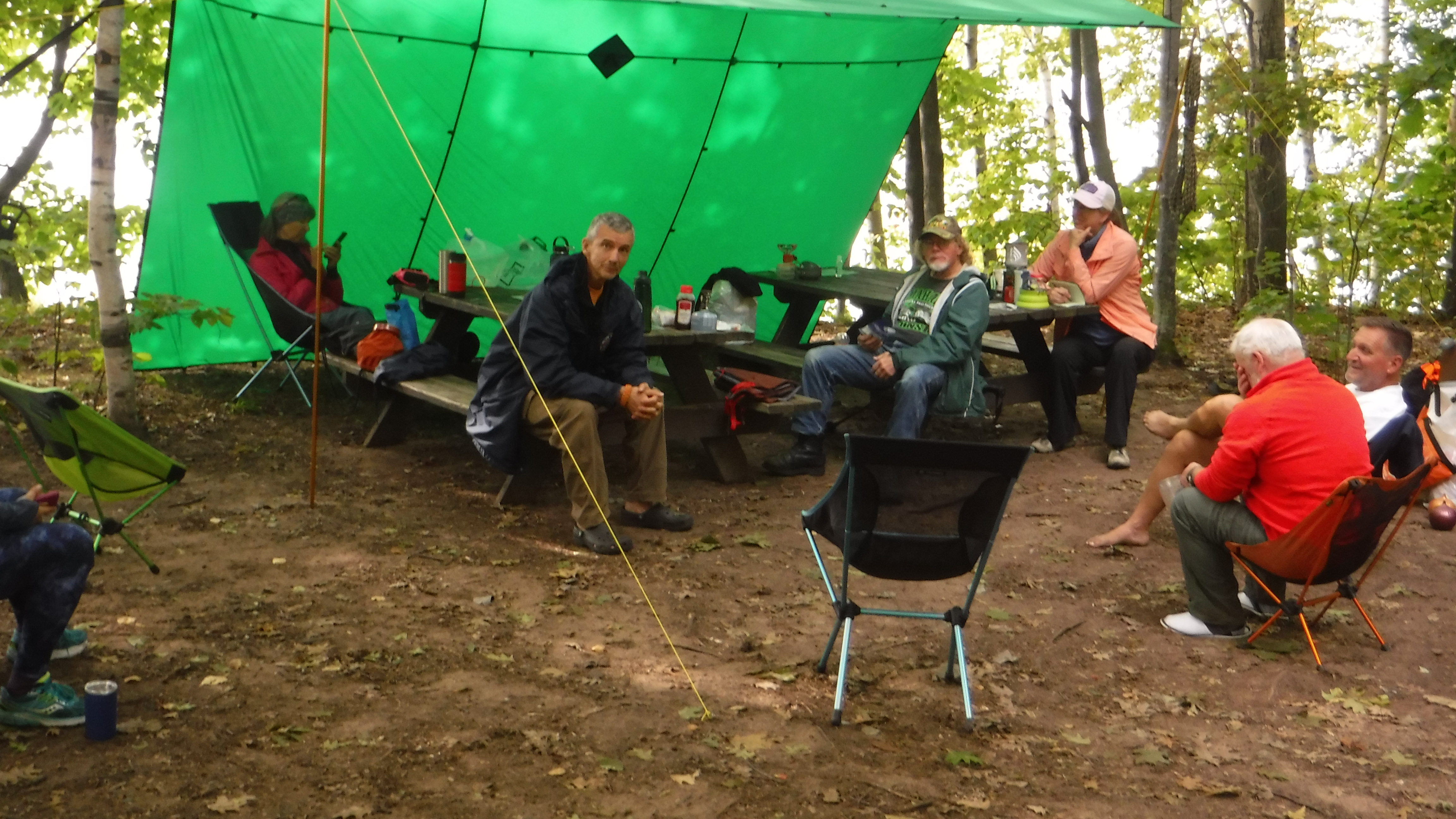 The new privy at group site A on Oak Island. Very nice indeed.The shoreline of Oak Island, as we head out on our Monday day trip to Manitou Island.Manitou Island Fish Camp. Five restored cabins stocked with tools and equipment used by Great Lakes commercial fishermen from the 1930s to 1950s.Some of us were more relaxed than others at the Manitou Island Fish Camp.Daren doing his Karate Kid thingManitou Island Fish CampManitou Island Fish CampCohen enjoys the crystal clear water of Lake Superior at the Manitou Island Fish CampReady to head out from Manitou back to our campsite on OakAfter the 10.6-mile paddle to and from Manitou Island, I went on a 4-mile hike back on Oak. Most of the leaves were still green, with a few spectacular exceptions.Greg R. and I were proud of our tarp-building abilities. Will and LT also contributed to design and construction.Tuesday day trip to explore the other side of Oak Island
